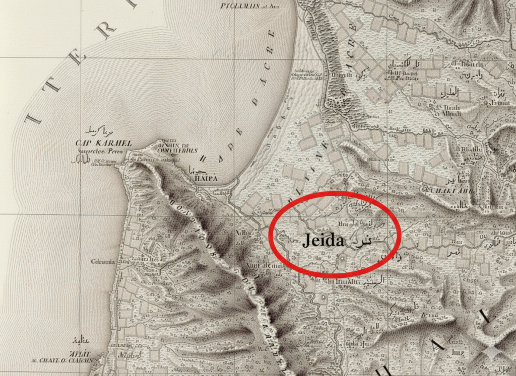 במאי 1870 ביצעו שני המודדים הצרפתים H. Mieulet – I.Derrien מיפוי של מערב הגליל מטעם המטה הכללי הצרפתי ופירסמו את מפת הגליל[23] Lev's En Galiile'e בה מופיעה ג'דה Djedda)) על אם הדרך בין חיפה ונצרת. במפה זו אין כל ציון למבנה בית האחוזה בקרבת הכפר.