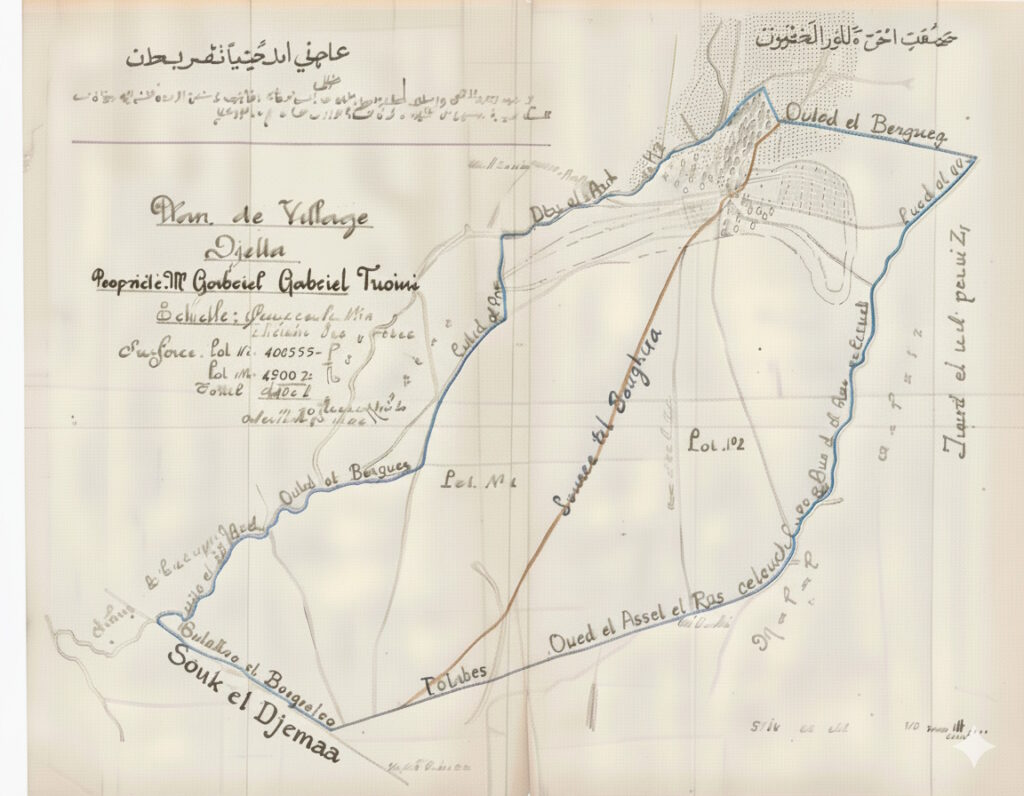 מפה זאת מספטמבר 1906 מתארת את הכפר והשטח החקלאי של גוש ג'דה-תל שמאם שהיה רכושו של גבריאל טוויני. צורתה דומה למפות קדסטריות של תחילת המאה העשרים. היא מורכבת משני גליונות מודבקים ומשורטטת ביד בקנה מידה 1:10,000 . שטח הנחלה הוא 12,640 דונמים טורקים (דונם טורקי שוה ערך ל 919 מ"ר) המחולקים לשתי חלקות, כמעט שוות בגודלן. שם הנחלה ובעליה מופיע בצרפתית ומעליו בערבית תיאור הגבולות ואלו נשענים על תוואי שטח כנקודות ציון בולטות. התיאור המופיע במפה תואם את שטר המכר[2] עליו חתומים יהושע חנקין ואליס טויני אשתו של אלפרד ג'ורג' טוויני שבבעלותה היו 10,338 דונם משטח גוש ג'דה תל שמם. חלקים אחרים מהגוש ובכלל זה הכפר תל שמאם היו רכושו של נחלי ביי טוויני. (הקו הכחול המופיע במפה מציין את גבולות נחלת גבריאל טוויני והקו הכתום מציין את הגבול שבין חלקה מס' 1 לחלקה מס' 2 ) מפת בעלויות קרקע נדרשה לצורך עסקאות מכר אך זאת לא לפני תחילת המאה העשרים[3]. גם אז היה מדובר בהוצאה כספית ניכרת. את הסיבות להכנת מפה זו יש לקשור לאחד מנסיונות המכירה של גוש ג'דה-תל שמאם או נסיון של בעלי הקרקע להגדיר את גבולותיהם במסגרת הגוש עקב בעיות ירושה או מכירה.